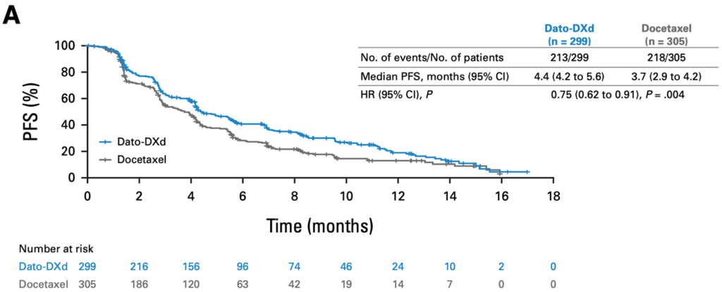 PFS中央値はDato-DXd群が4.4か月、Docetaxel群が3.7か月でした。ハザード比(HR)は0.75(95% CI:0.62-0.91)、P値: 0.004でした。