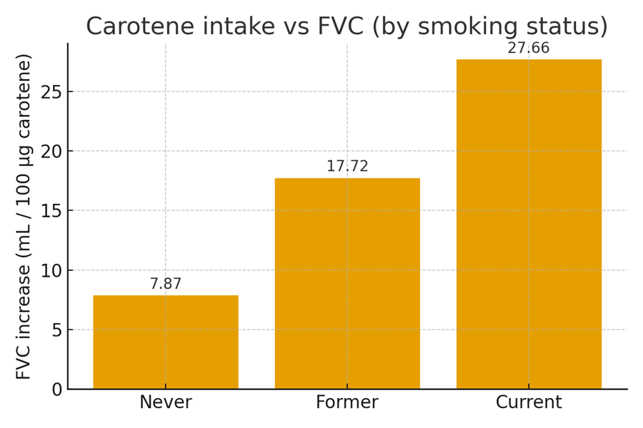 観察分析では、カロテン摂取量とFVCのみに正の相関関係があることが示唆され (100 µg/日あたり13.3 mL、p=2.9×10 -9 )、喫煙者ではその相関が強く、レチノール摂取量とFVCまたはFEV 1 /FVCには関連が見られませんでした。MRも同様に、血清β-カロテンがFVCにのみ有益な効果をもたらすことを示し、血清レチノールはFVCにもFEV 1 /FVCにも影響を与えませんでした。ビタミン A関連遺伝子のうち9つは成人の肺機能と関連していましたが、そのうち6つはゲノムワイド研究でこれまで同定されておらず、3つ ( NCOA2、RDH10、RXRB ) は肺機能の遺伝子研究のいずれにおいても同定されていませんでした。5つの遺伝子は、遺伝子とビタミンA摂取量の相互作用の可能性を示しました。