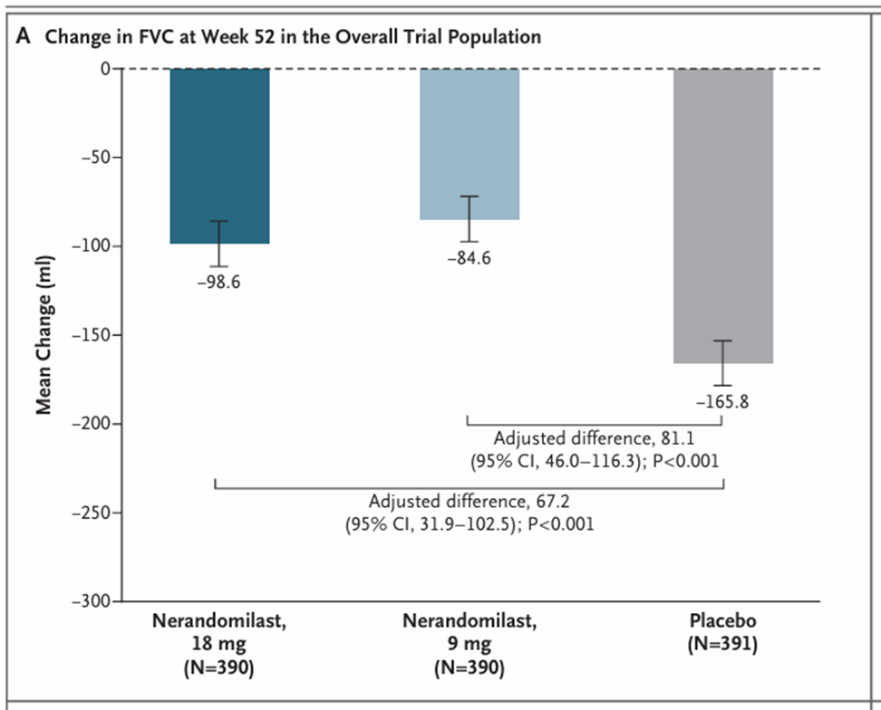 52週の時点におけるFVCの補正後の平均変化量は、ネランドミラスト18mg群で-98.6 mL(95%信頼区間 [CI] -123.7~-73.4)、ネランドミラスト9mg群で-84.6 mL(95% CI -109.6~-59.7)、プラセボ群で -165.8 mL(95% CI -190.5~-141.0)でした。ネランドミラスト18mg群とプラセボ群との補正後の差は67.2mL(95% CI 31.9~102.5,P<0.001)であり、ネランドミラスト9mg群とプラセボ群との補正後の差は81.1mL(95% CI 46.0~116.3,P<0.001)という結果でした。なお最初の12週間はFVC改善効果を示し、こちらはネランドミラストの抗炎症効果によるものと考えられます。またニンテダニブ使用例、非使用例のいずれでも52週時点でFVC低下を抑制しました。18mg群に限定すると急性増悪は減少し、死亡は18mg群でも9mg群でも減少しました。