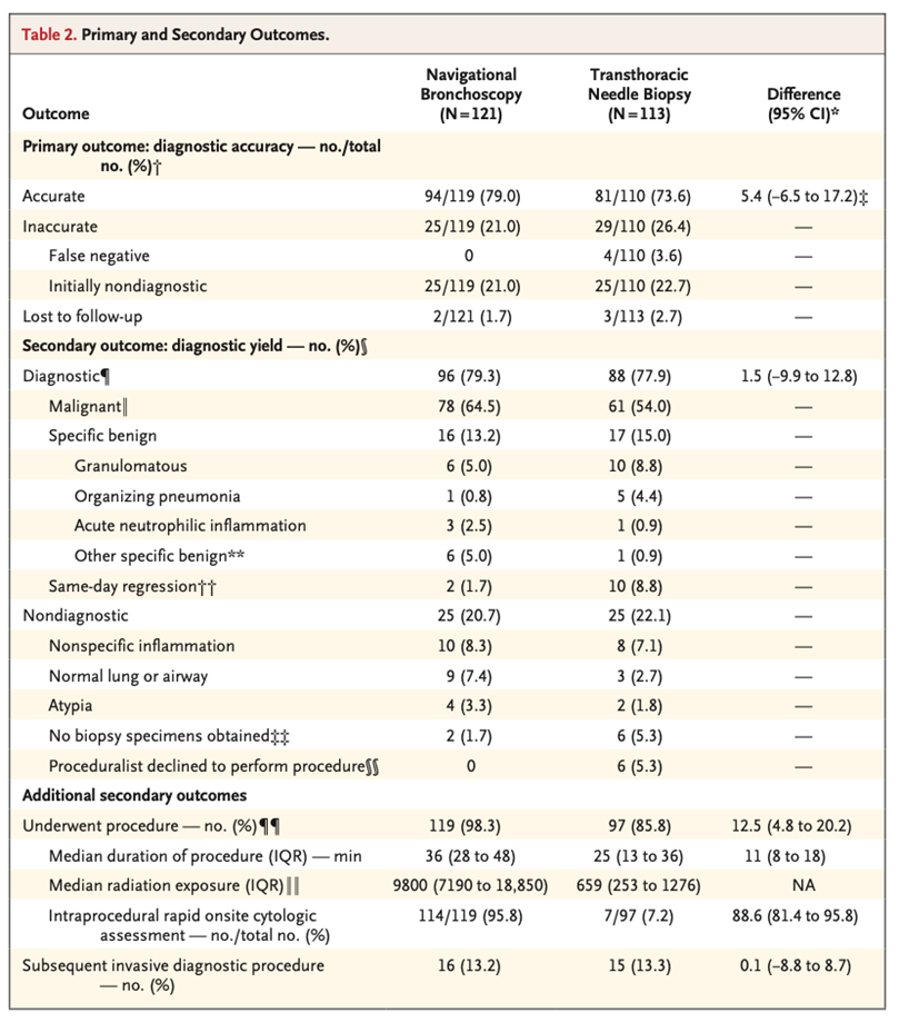 主要評価項目の診断の正確性に関しては両群で有意差はなく、副次的評価項目である主義の所要時間も有意な差はありませんでしたが、有害事象は経皮的CTガイド下針生検群の方が多く(気管支鏡群では5.0%、針生検群では29.2%)、代表的な有害事象である気胸も